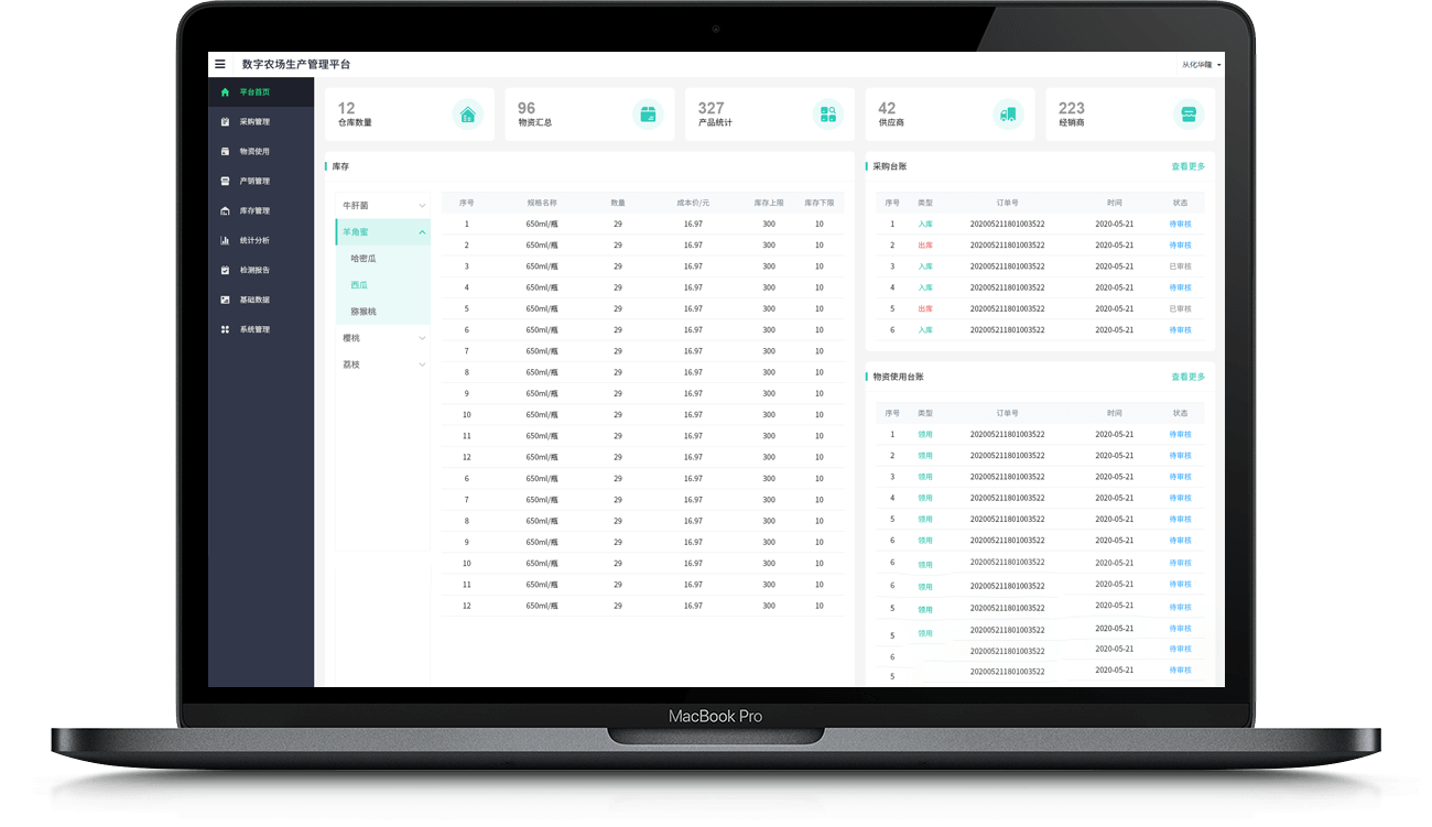 打通種植計劃 > 農資采購 > 物資使用 > 產品采收 > 出庫銷售全業務流程,提升運營效率。