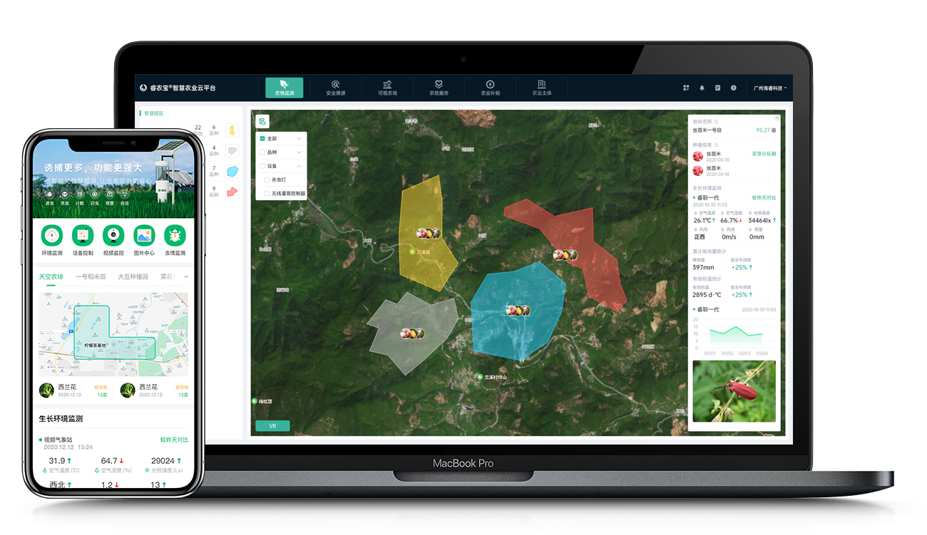 無論您身在何處均可以通過睿農寶?智慧農業(yè)云平臺遠程控制補光燈、風機、卷簾機等生產設備,您也可以通過設置策略,結合環(huán)境參數的情況,讓設備智能運作,保證農產品在適宜的環(huán)境下生長。